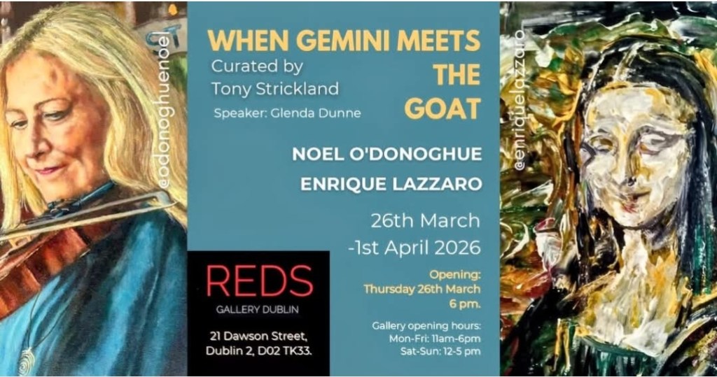 Next Exhibition 26th March 2026 at Reds Gallery in 21 Dawson Street Dublin, curated by Tony Strickland, “When Gemini Meets the Goat” , traces the fascinating evolution of his artistic language – from early explorations to his latest powerful expressions. The showcase features rare early works inspired by Cézanne’s impressionism, including pieces like Girl with a Doll, where soft, luminous brushwork pays homage to the master’s focus on form and light. Here, influences of Jack B. Yeats’ lyrical connection to place and Picasso’s cubist daring begin to emerge, marking the start of Lazzaro’s distinctive fusion of styles.